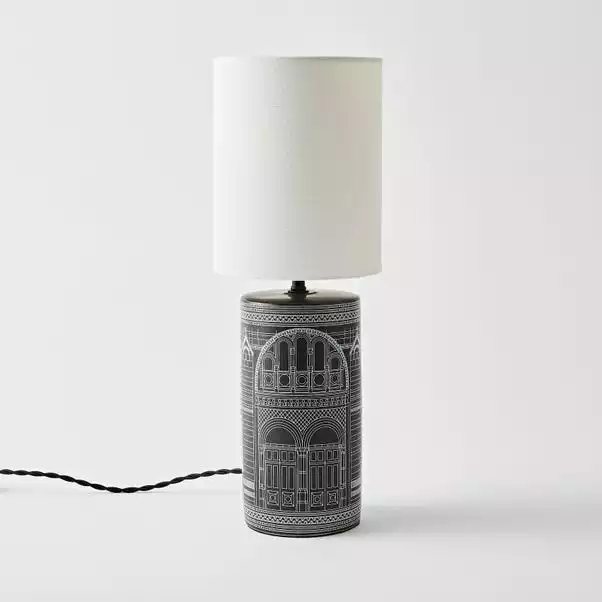 Inspired by the Natural History Museum, this stunning black and white table lamp comprises the intricately detailed architecture of the Natural History Museum. The lamp includes a timeless linen shade which is bound to set your room with the perfect ambience. Finished with a stylish twisted fabric cable for a more luxurious look.