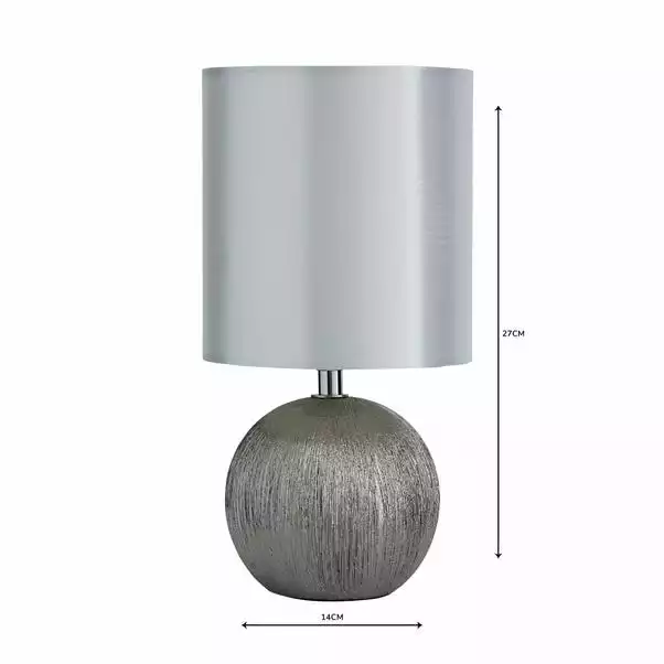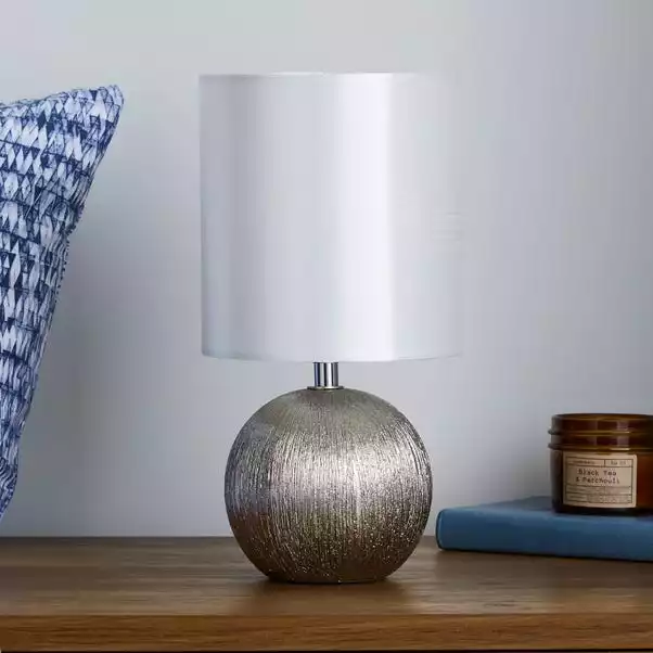 This stunning ceramic lamp features a three stage touch mechanism so you can adjust your lighting to suit your mood. It comes in with an interesting, textured design on the base, metallic silver finish and a luxurious satin fabric shade.