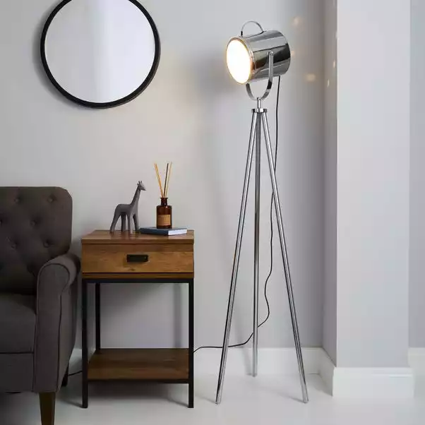 This chrome camera style floor lamp will add a modern feel to your room. With an adjustable shade angle you can light up any corner. This floor lamp has a foot switch with a 150cm cable.