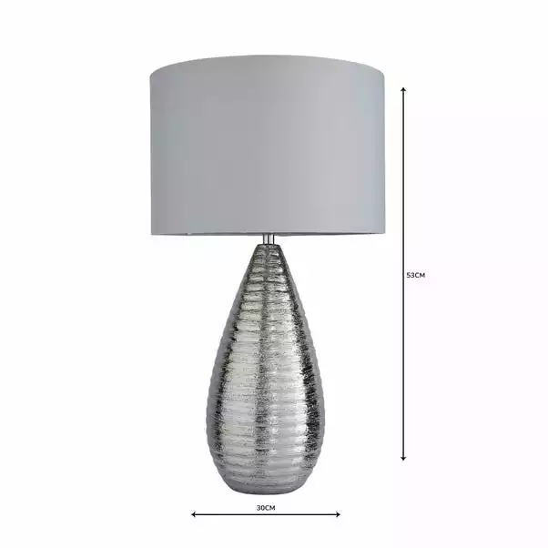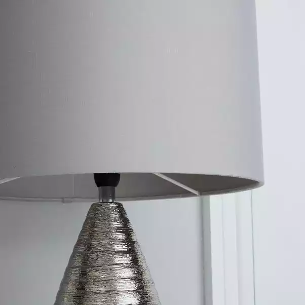 Add some style to your interior with this chrome designed ceramic table lamp. It features a lovely, textured chrome base with a brushed cotton mix shade in a light grey colourway.
