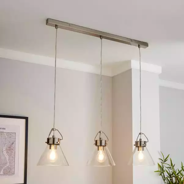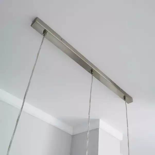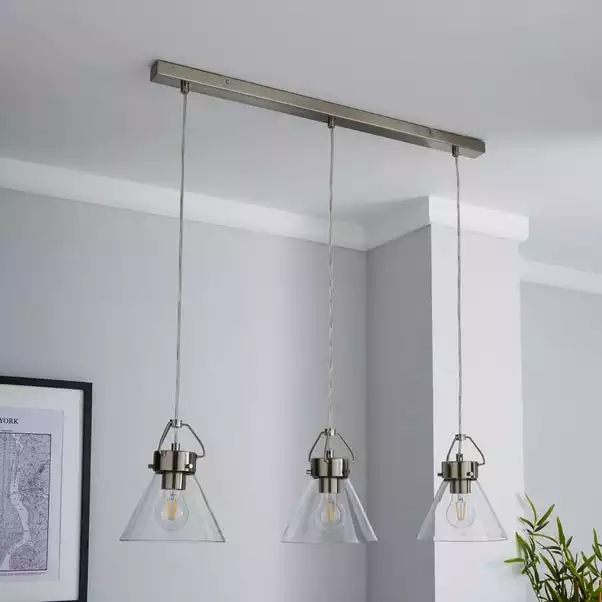 The Delavin 3 Light Pendant features a stunning Satin Nickle finish as well as an elegant tapered glass shade. This lamp is adjustable, dimmable and features a strong and durable steel construction.