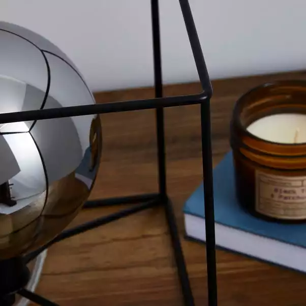 With a black wire frame, this table lamp will be a statement piece in your home, with its smoked glass shade.