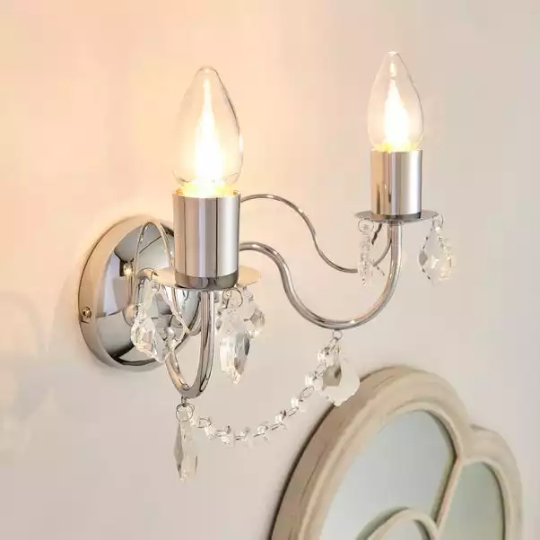 This Elizabeth dimmable wall light features a stylish chrome finish, draped in faceted glass droplets, perfect for adding a touch of glamour to your home.