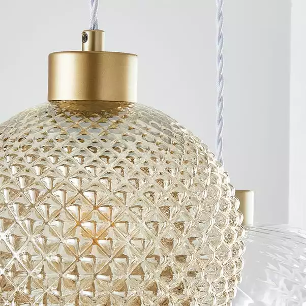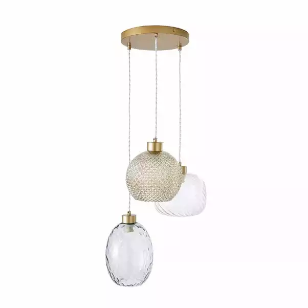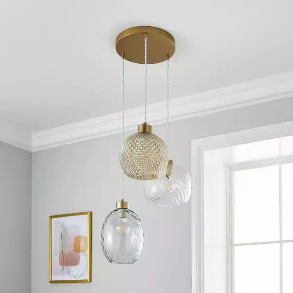 Featuring the Elodie 3 Light Cluster Ceiling Fitting , this stunning ceiling fitting with gold-painted details features 3 unique glass designs in coloured and clear shades. Each glass is suspended from a white twisted cable and can be varied in height. This beautiful ceiling fitting will complement an array of decors and matching family items are also available, making coordinating your home even easier.