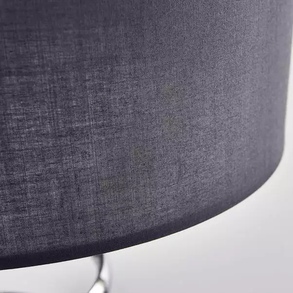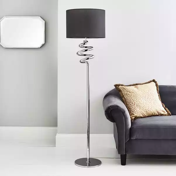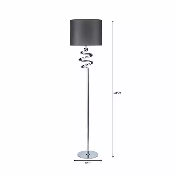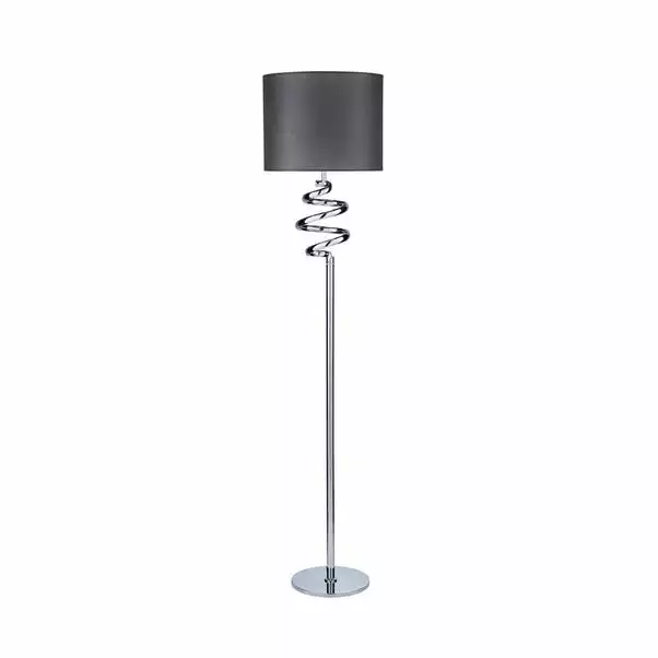 Add a stylish feature to your room with this spiral design floor lamp. Featuring a grey fabric shade and a modern chrome finish, this light comes supplied with a useful in-line floor switch.