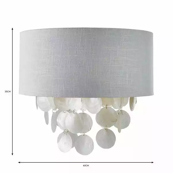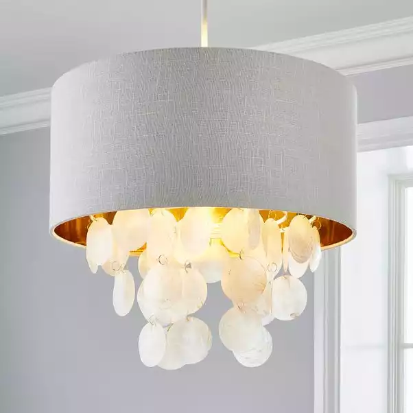 Boasting a beautiful faux linen shade with gold cardboard inner, our Gemini Capiz Easy Fit Pendant is complete with hanging natural capiz shells. The pendant is easy to fit making it perfect for renters. A maximum bulb wattage is 13 watts with the pendant being suitable for ceiling lights only.