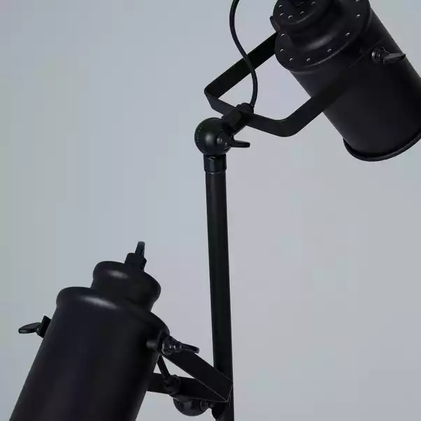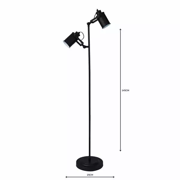 Featuring a sleek black painted finish, this contemporary floor lamp is designed with two adjustable spotlights which tilts in the direction you want. A simplistic design to suit any interior.