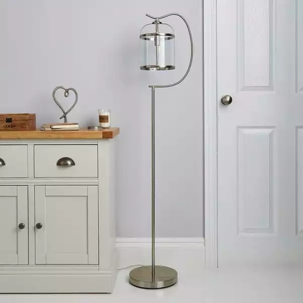 Designed with a traditional antique style The Hurricane floor lamp would add a classic touch to any home décor styles. This elegant floor lamp boasts a gorgeous satin nickel finish and features a slim metal stand complete with curved arm and a suspended glass lantern.