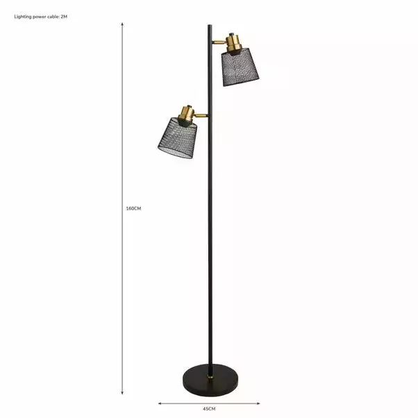 Offering a gorgeous modern style, the Idris floor lamp is finished in a contemporary matt black finish with contrasting antique brass features for an industrial look. Perfect for any living space, this fitting features two adjustable fixtures at varying heights with metal mesh shades.