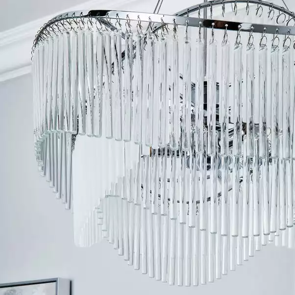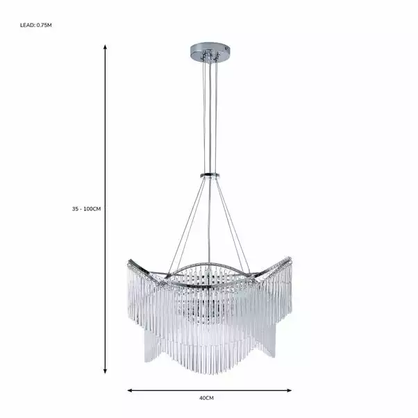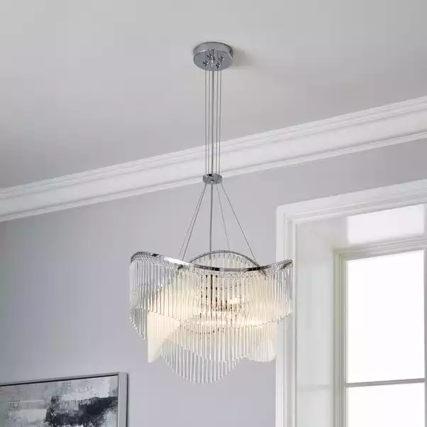 Add grandeur to your home with this stunning cascading decorative ceiling fitting, perfect for adding that touch of luxe and glamour to any room. With polished chrome metalwork on a height adjustable suspension and a mix of clear and frosted glass rods, this celling fitting will make an elegant and modern addition in any home. This light is perfect for the most loved rooms of your home and is dimmable with a compatible dimmer switch and bulbs.
