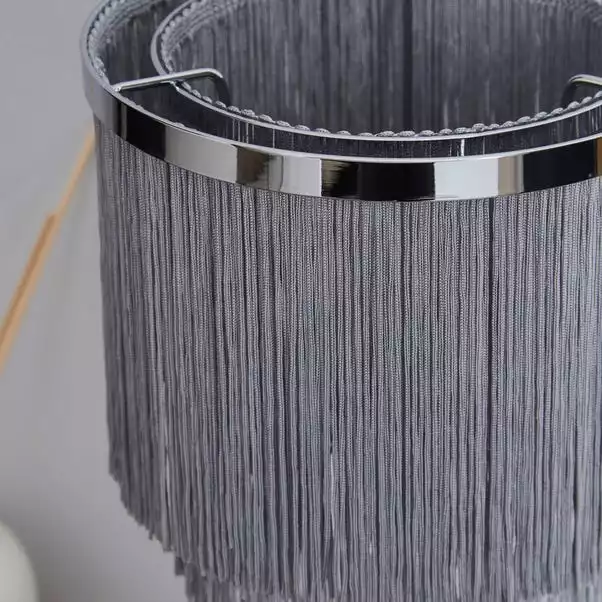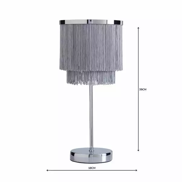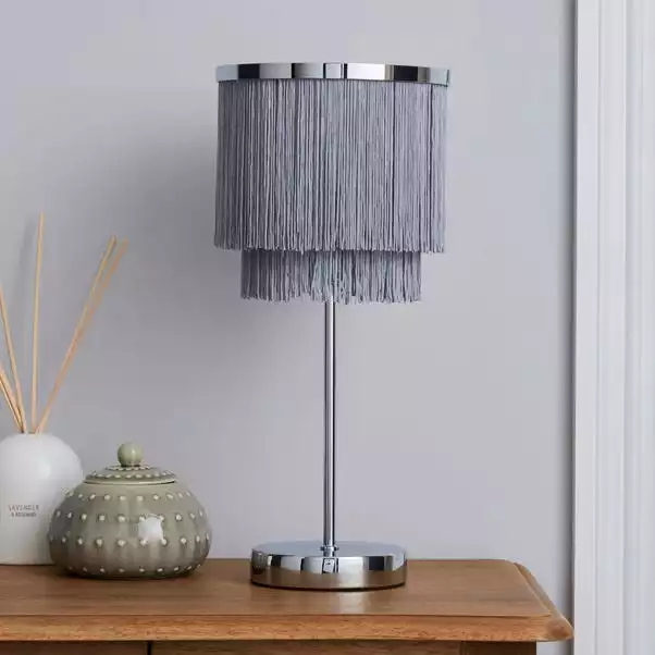 Add a retro touch to your home with this stunning chrome table lamp. Designed with a stunning two tiered shade with a tactile, grey fabric fringing, the Jaz table lamp would be a beautiful addition to any room and is available in a choice of trendy colours.