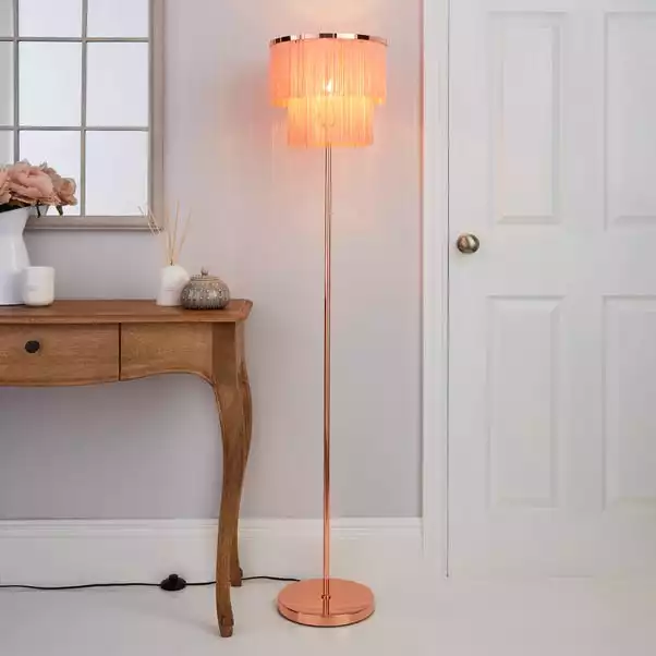 This Jaz floor lamp features a two tier tassel fringe shade with an inline floor switch, a cable length of 100cm and completed with a smooth chrome finish.