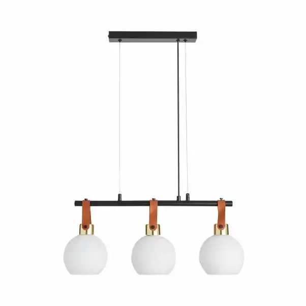 Featuring a modern contemporary design, the Joan 3 Light Diner Ceiling Fitting is beautifully crafted with 3 hanging white glass shades and finished in black metal with a Faux leather strap. With its modern colour way, this light will complement an array of home decors. Pair this ceiling fitting with available matching Joan pieces to complete the look.