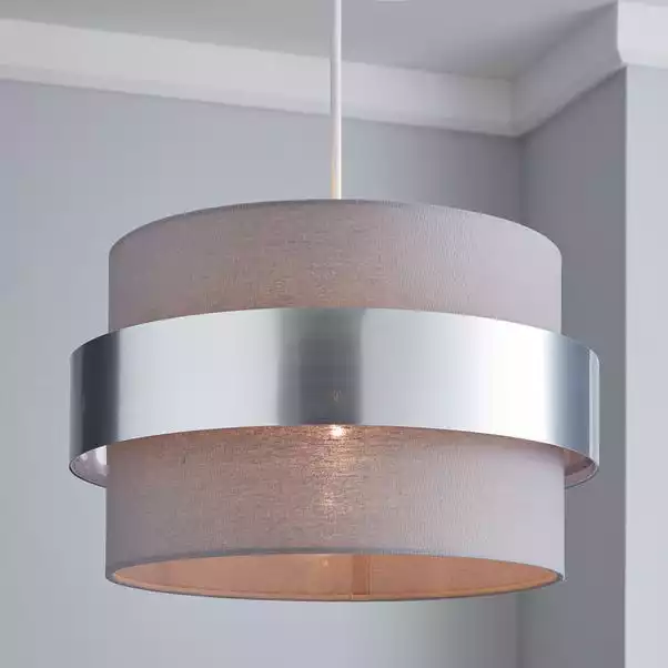 Finished with a grey faux linen effect shade complete with a brushed chrome band this Joey pendant boasts a contemporary tiered design.