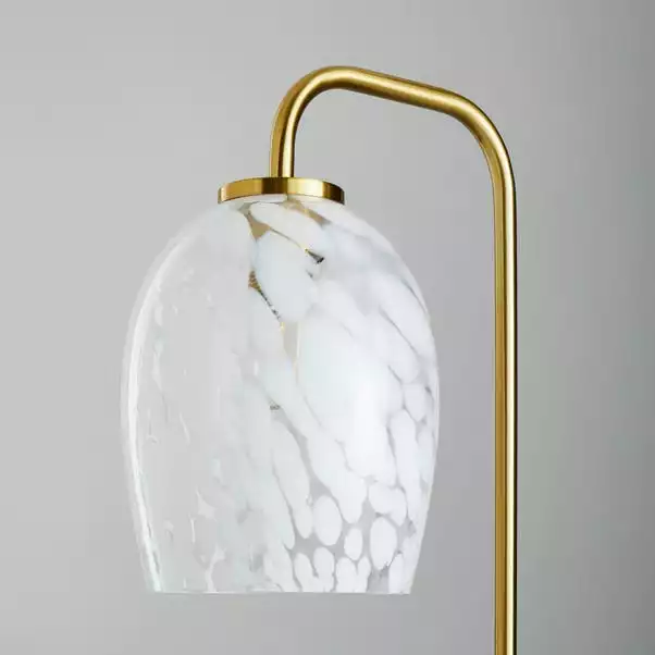 Part of the luxe traveller trend, The Lilo Floor Lamp is perfect for adding a modern, decorative touch to any space. This stunning lamp features a stunning gold effect finish, a chic shallow tortoise and confetti glass shade, and a complementing black fabric flex with an inline foot switch. Matching items are available to help coordinate your home. The Lilo floor lamp is available in two colours.