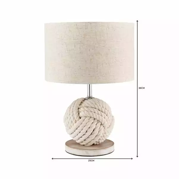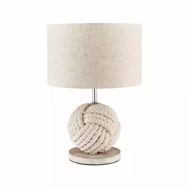 This Lina table lamp features a white washed rope knotted into a ball to create a unique lamp base. Supplied with a natural, faux linen fabric shade this lamp has a useful in-line switch and would be a wonderful addition to a range of interiors.