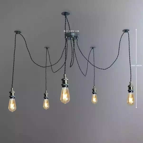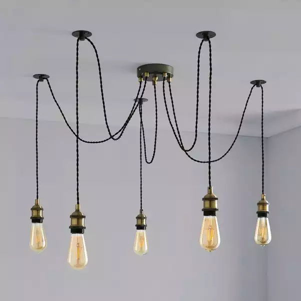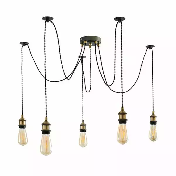 This industrial inspired logan spider fitting features a dark nickel painted finish and black fabric flex cables with an antique, brass detailing. Bulb holders and chords can be positioned easily by using the ceiling hooks provided. This light is adjustable in height and width.