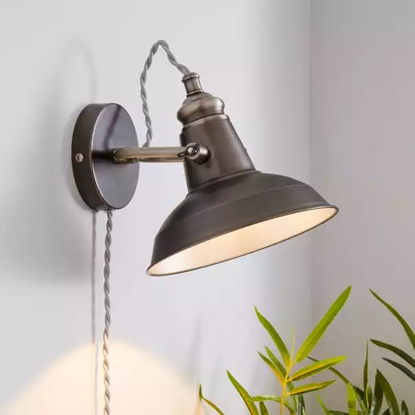Enhance your home décor with the Lucas Wall Light which also comes with a plug, featuring a twisted fabric flex and industrial detailing, the inside of the wall light has been silver coated for a stunning contemporary appearance that will fit perfectly in a variety of home decors. This light has a cable length of 180cm.