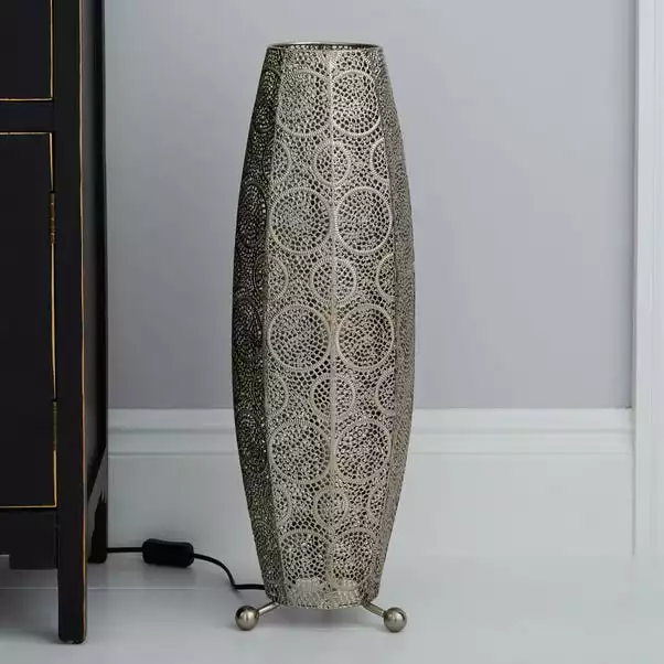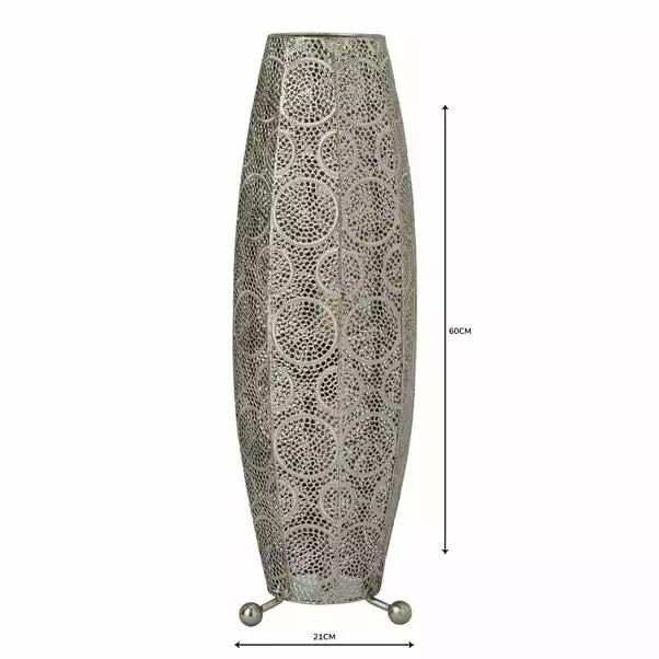 Crafted with a rich chrome finish, this unique Moroccan inspired mid-size floor lamp features a detailed cut out pattern in a striking design.