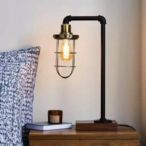 Add an industrial inspired touch to your home with this pipe design table lamp. It features a dark brown, wooden plinth base and an antique brass case to protect the bulb.