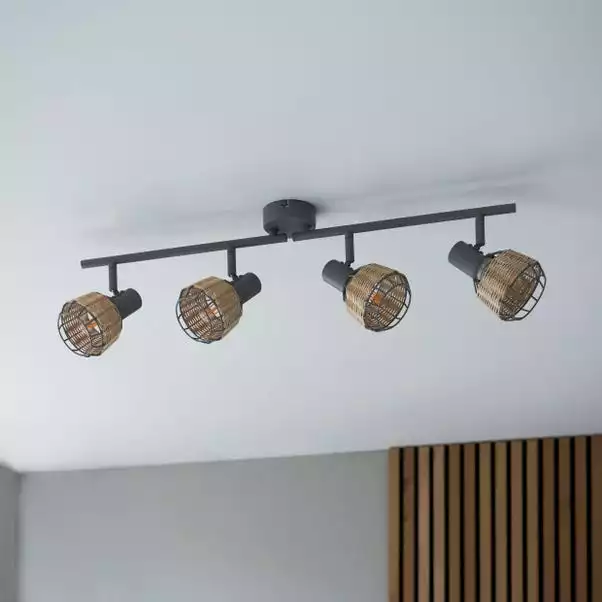 Add a natural touch to your home with this modern Ohio 4 Light Spotlight Bar. Designed with a matt light grey metal base and 4 natural wicker rattan spotlight shades, beautifully woven around the grey metal wire. Complete with a grey split bar that allows further adjustment options. This spotlight will look beautiful in any room and you can even coordinate your home with matching family items. Dimmable compatible with a suitable light switch and bulb.