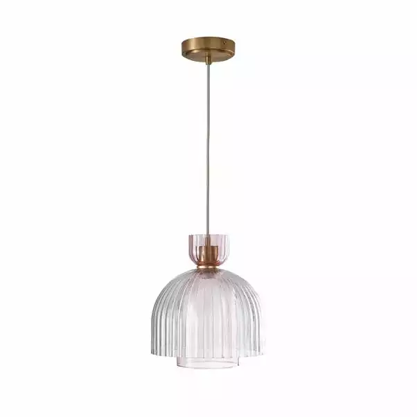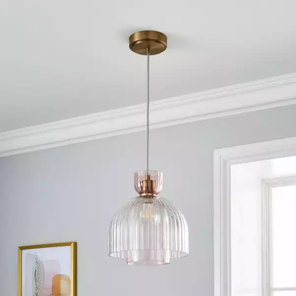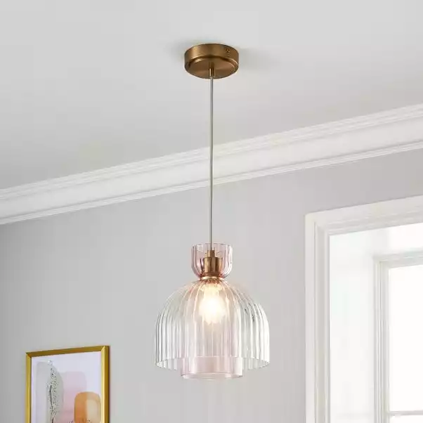 Featuring a gorgeous fluted transparent pink glass shade, combined with a pink ribbed glass shade. The Ora 1 Light Ceiling Fitting would be perfect for adding a feminine touch to your home. The Ora is detailed with champagne brass metal and a height adjustable grey fabric cable suspension. Coordinate your home with matching family items.