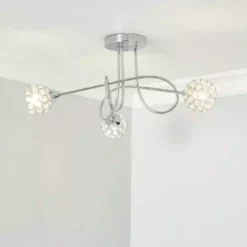 This stunning Portia ceiling light, with a swirled arm structure, 3 lights and 3 spherical acrylic shades will complement an array of home decors beautifully. The acrylic jewel beads design adds a touch of glamour, along with the chrome finish. The matching wall light, table lamp and floor lamp are also available.
