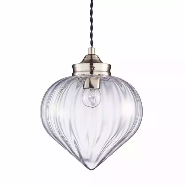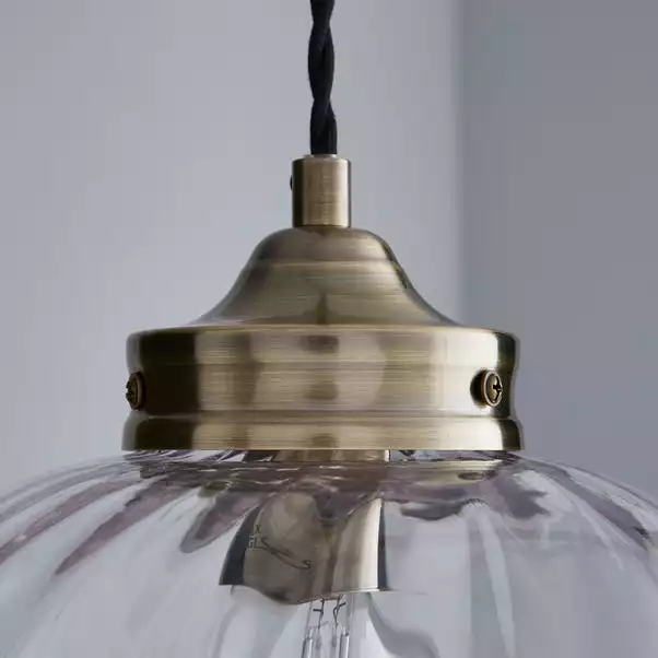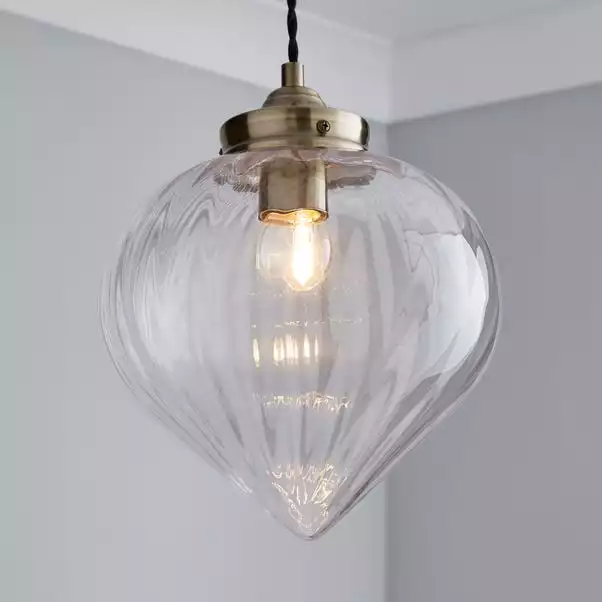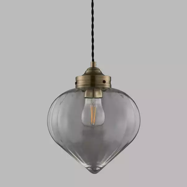 Featuring a shaped glass shade, this dimmable light fitting hangs from a twisted flex and is finished with an antique brass effect plate.