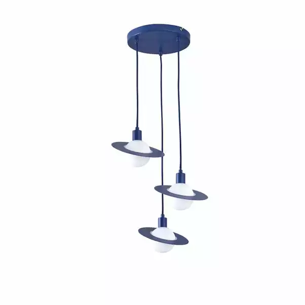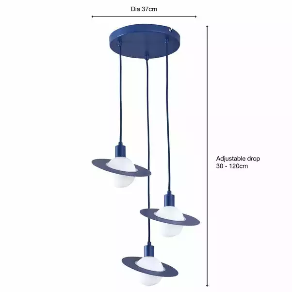 Introduce a fun touch to your kids bedroom with this modern contemporary Saturn 3 Light Cluster Ceiling Fitting. Beautifully designed with three height adjustable cluster light pendants in the shape of the planet Saturn, made from steel and glass. Pair this light fitting with matching family items to help coordinate your little ones bedroom. Suitable for use with LED lamps and dimmable compatible with a suitable light bulb and switch.
