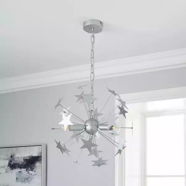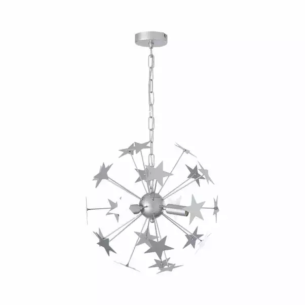 Add a starry light to your kids bedroom with this striking silver Star Sputnik 6 Light Ceiling Fitting, beautifully crafted with 6 lights and multiple stars placed carefully to form a circular design. This luxurious piece has a silver effect paint finish base and a height adjustable chain set. Dimmable compatible with a suitable bulb and switch.