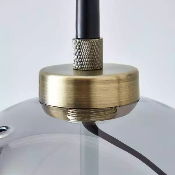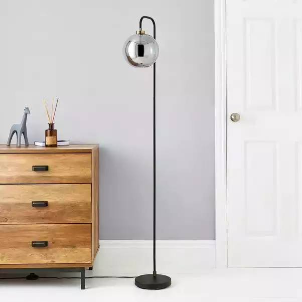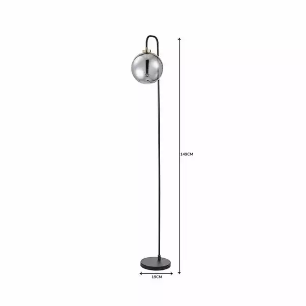 Featuring a black base and a curved stem, this Tanner floor lamp is the perfect way to add a modern touch to your home. It has a stunning large smoke glass sphere, which turns clear when switched on and a useful in line foot switch.