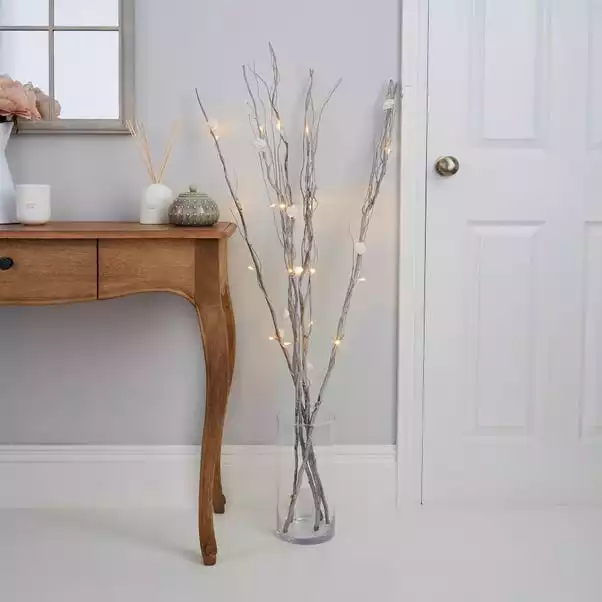 Beautifully crafted, this stunning twig light has 20 warm white LED lights and is made with 4 grey washed twigs, each with two white rose decorations. Requires 3 x AA batteries.