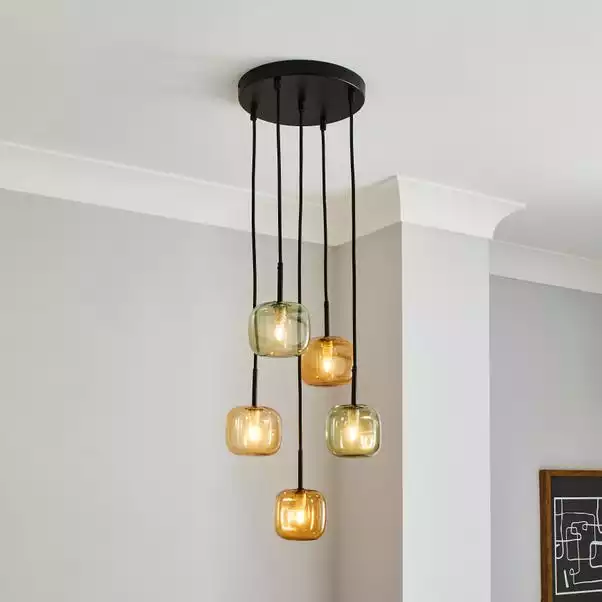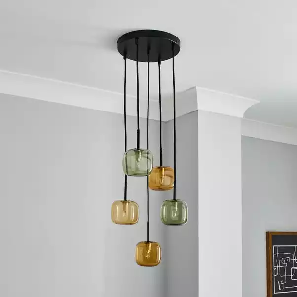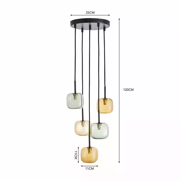 This stunning cluster fitting has a contemporary design that will complement an array of home decors, alongside its stylish colourway. The Elements Tollose 5 light features 2 Green and 3 Amber Square Glass Shades with a rounded edge. It is perfect for homeowners as the height can be adjusted to suit your space. Compatible with dimmable lighting and matching family items are also available to coordinate any room of your home.