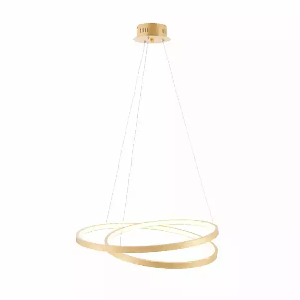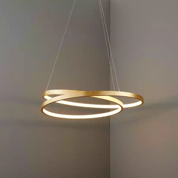Boasting a contemporary designer style, this ceiling fitting includes an elegant and opulent gold leaf finish, that’s adds the wow factor to any room. This light has 33W integrated LEDs (1650 lumens). This light is warm white 3000k and has an adjustable height.