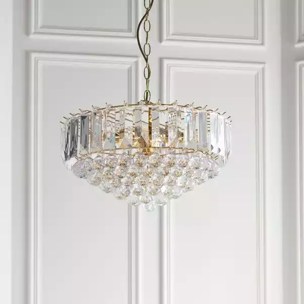 Finished in a brass effect with delicate clear acrylic detailing, the Tioga Pendant would make a glamorous addition to any home. This fitting has a height adjustable drop, is compatible with dimmer switches and suitable for use with LED lamps.