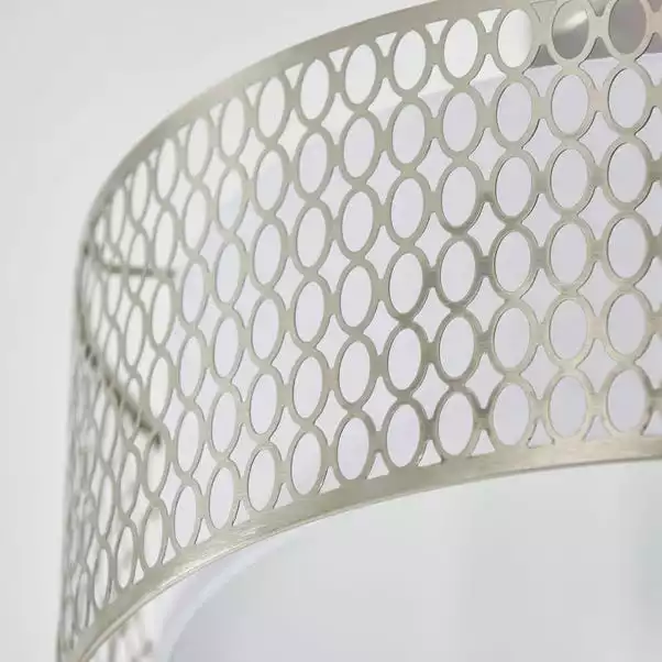 The stunning Vogue Tolna 3 Light flush ceiling light features a classic circular design with a trendy geometric fretwork, finished with an inner fabric shade for lovely light diffusion. This modern design is dimmable and perfect for low ceilings.